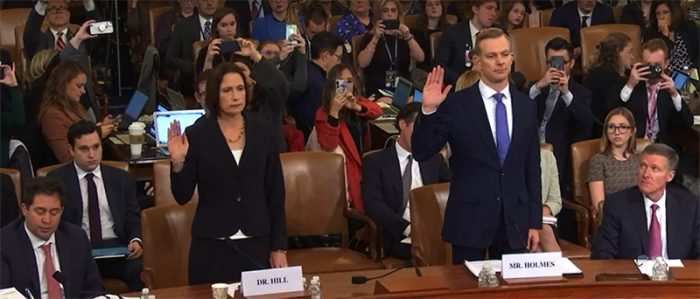 ▲画像 米下院情報特別委員会・弾劾調査公聴会で宣誓する証人。(2019年11月21日)出典: YouTube; House Intelligence