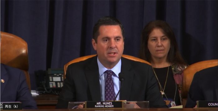 ▲画像 米下院情報特別委員会での弾劾調査公聴会で発言する共和党・デビン・ヌーナス議員(2019年11月21日)出典: YouTube; House Intelligence