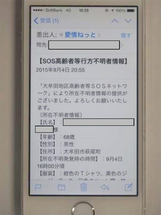 具体的にはこうだ。家族がまず、警察へ捜索願いを出す。すると、市内の役所や企業、公共機関などに捜索者の情報が配信される。その情報は市民、およそ6500人にも送られる。「愛情ねっと」と呼ばれるメール配信システムに登録しているからだ。登録者は学生から年配の方まで幅広い。実際にこのシステムで95歳の母親をみつけてもらった人はこう話す。