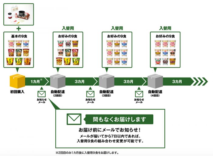 そして、入れ替え用9食のカップヌ―ドルが3か月に一度届く仕組みだ。つまり、賞味期限の管理が不要になる。9食の中身は毎回変更可能、ときめ細かい。価格は3ヶ月毎に2,000円(税抜き)、月にすれば560円だ。