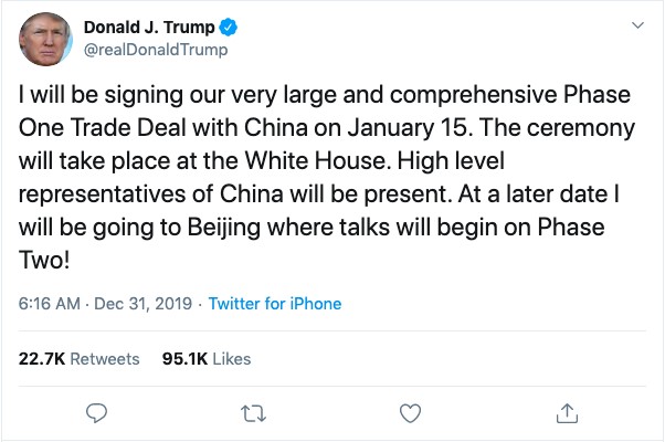 ▲写真 トランプ大統領ツイッター(2019年12月31日) 出典)Twitter: Donald J. Trump