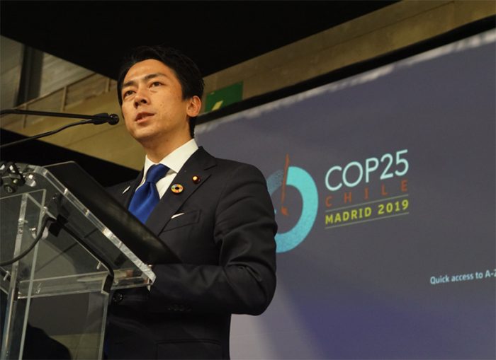 ▲画像 スペイン・マドリードで開かれたCOP25でスピーチをする小泉環境相 出典: Green Climate Fund twitter