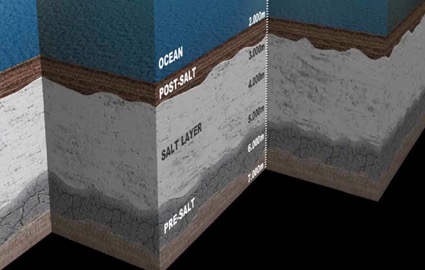 ▲プレソルト層を示す図版。ペトロブラスはブラジル沖で水深7000mまで掘削して石油を採掘している。岩塩層下にあるプレソルト層の油田のためプレソルト油田と言われる。図版はPETROBRAS社資料『PRE-SALT』より。