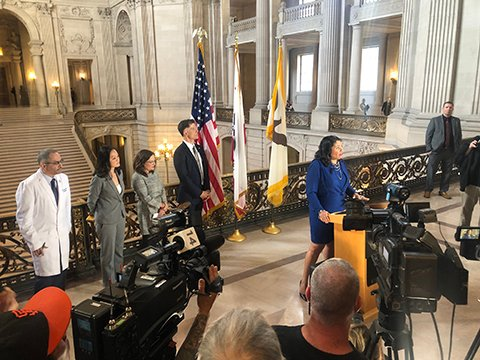 トップ写真)緊急事態宣言を行う、ロンドン・ブリードサンフランシスコ市長 2020年2月26日