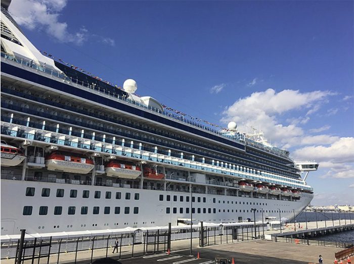 ▲写真 横浜市中区新港にある複合施設「横浜ハンマーヘッド」(新港ふ頭客船ターミナル)へ第一号入港したクルーズ客船「ダイヤモンドプリンセス」2019年11月4日 出典:Photo by NEO-NEED