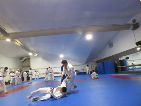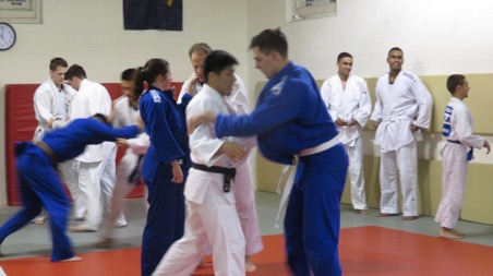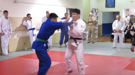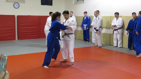 中矢選手は同クラブでは男女50人ほどを相手に、まず背負投などの得意技を解説した後、乱取り練習を長い時間、続けた。地元選手たちは世界の強豪との手合わせとあって、先を争って挑んでくる。このクラブはアメリカ人の学生のほか弁護士、医師、公務員、軍人、企業家など多彩な職業人が大多数で、柔道歴が長いベテランの黒帯が多い。だから日米交流という点ではきわめて広範かつ多層となる。