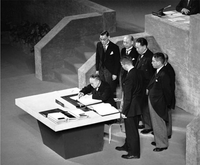 ▲写真 サンフランシスコ平和条約に署名する吉田茂と日本全権委員団。米・サンフランシスコ市 1951年9月8日 出典:作者不明