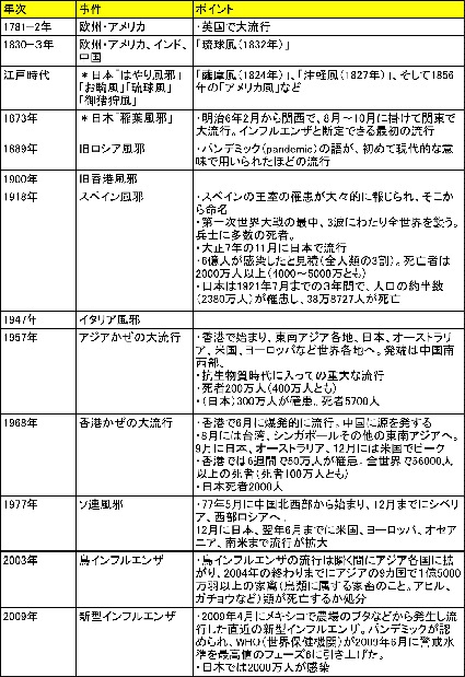 つまり我々の祖先はこうした感染症と戦ってきたのだ。歴史的に起こってきたし、今後も起こりうると言える。驚くことではないし、そうした事実を踏まえて今回の新型コロナウィルスの件を見なければならないだろう。特に、インフルエンザ(インフルエンザウィルス急性感染症:上気道炎症状・呼吸器疾患)だけでも、多くのパンデミックが起こってきた。まとめると以下のようになる。