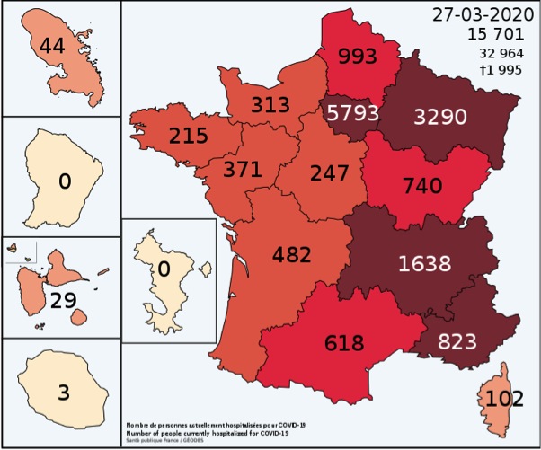 フランスでも毎日300人~400人の患者が亡くなっていく。亡くなった患者の中には、特に健康状態に問題がなかった16歳の少女も含まれる。重症患者は3000人台となり(50%は60歳未満)日々増加し続けているのだ。もうすでにパリとパリ周辺の病院では、重病患者のベッドも足りなくなり、まだ感染が大きく広がっていない地域への輸送も検討されはじめた。
