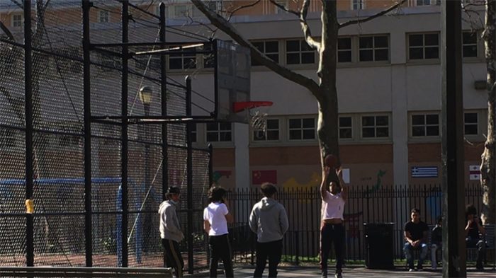 帰り道、途中にある公園では、多くの若者がバスケットボールに興じていた。