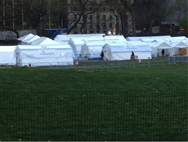 セントラルパークにも「病院」が作られた。新型コロナ感染者用のベッドを置ける適当な市内の施設がきちんと確保できず、緊急援助支援団体の協力で68床の野戦病院型のテントが設営された。