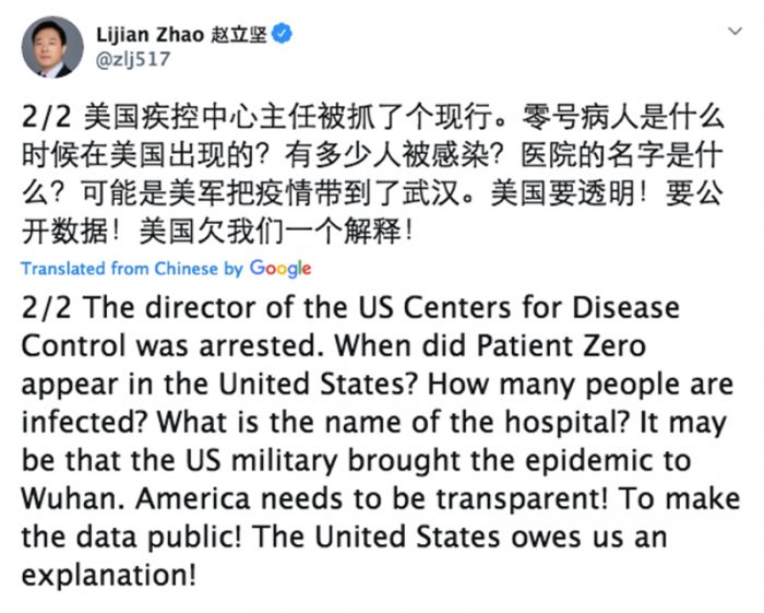 ▲画像 「コロナウイルスは米軍により持ち込まれたかもしれない」という内容が記されたツィート。 出典:Twitter tweeted by LijianZhao