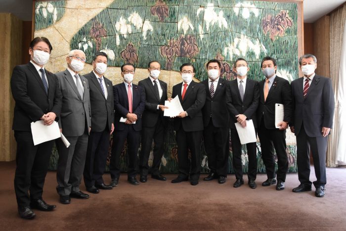 ▲写真 緊急事態宣言の対象区域への追加に関する要望を受け取る大村知事 出典:大村知事Twitter