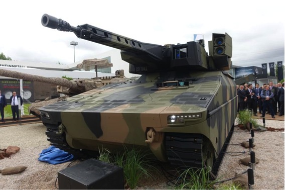 ▲写真 ラインメタル社のICV、リンクス。最大戦闘重量が44トンで無人、1人乗りが選択できるLANCE砲塔システム採用している。またゴム製履帯を採用している。またゴム製履帯を採用している。(著者提供)