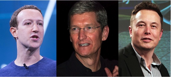 ▲写真 トランプ政権はマーク・ザッカーバーグ氏(左)、ティム・クック氏(中)、イーロン・マスク氏(右)らを経済再開協議会メンバーにした。