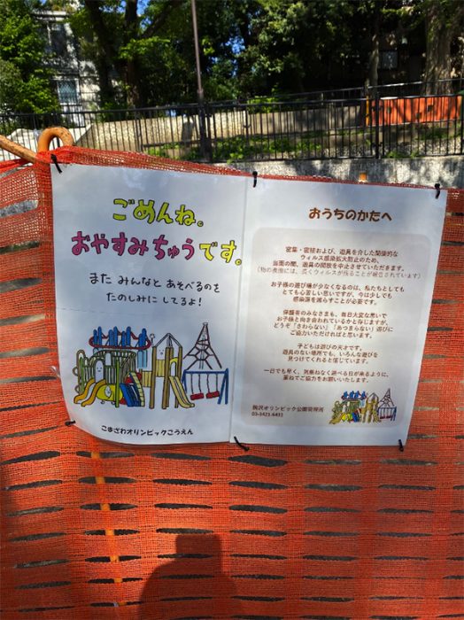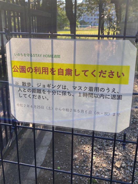 園のところどころに利用自粛のサインが設置されている。マスク着用や、人との距離を保つこと、1時間以上の長居をしないように記載されているが、ほとんどの人が気にしていないようだ。