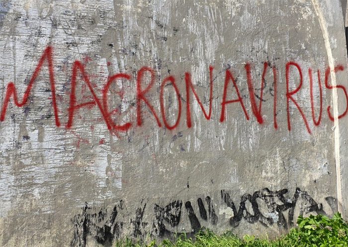 ▲写真 「マクロナウイルス」とマクロン大統領を揶揄する落書き。題名には「40日間監禁」とも書かれている。(2020年4月25日撮影/パリ)出典:flickr / Paule Bodilis