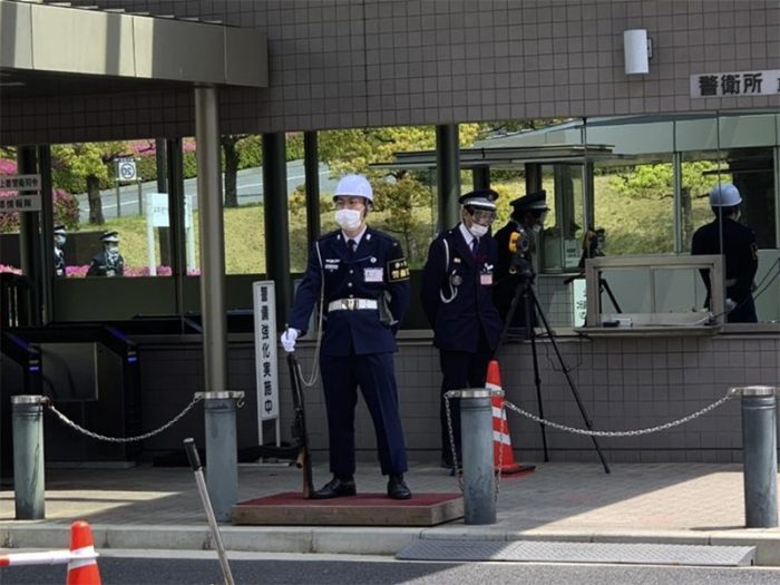 4月10日、防衛省定例の河野太郎防衛大臣会見が行われた。通常防衛省の会見は防衛省の中枢であるA棟、10階の会見室で行われるが、三密を避けるために11階のより広い会議室で行われた。参加者同士の距離は大きく取られて、入館に際しては手の消毒とマスクの着用が求められ、発熱のあるものは参加を自粛するように求められていた。また防衛省正門ゲートや建物の受け付けでは担当者がマスクに加えてゴーグルを着用したり、透明のシールドをかけたりしている。