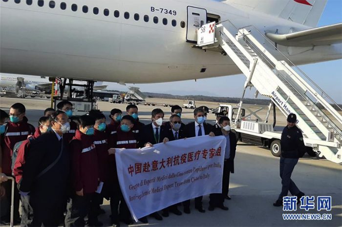 ▲写真 イタリアに到着した中国の感染症対策専門の医療チーム(2020年3月18日 ミラノ)出典: CDCCA
