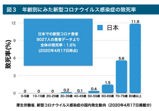 NHKの報道では、感染者のうち「死亡したのは全体の1.6%にあたる171人でした。最も多かったのが80代以上で87人、次いで70代が50人、60代は21人、50代は7人、30代と40代がそれぞれ2人」というレベルである。ほぼ60代以上がほとんど。