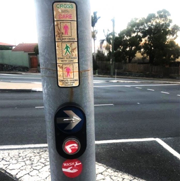 クイーンズランドの歩行者用信号は、青にするためにボタンを押す必要があるが、現在シティー中心地では感染拡大対策のため自動で切り替わるようになっている。少し郊外に行くと自動ではないが、手洗いと、ボタンを腕で押すよう呼びかけるステッカーが張られている。