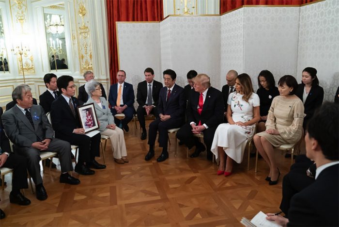 ▲写真 来日中のトランプ大統領と面会する拉致被害者家族ら。安倍首相の右隣りに横田めぐみさんの母・早紀恵さん、その右隣りでめぐみさんの写真を持つ弟・拓也さん、早紀恵さんの後ろに弟・哲也さん。(2019年5月27日 赤坂迎賓館) 出典: White House