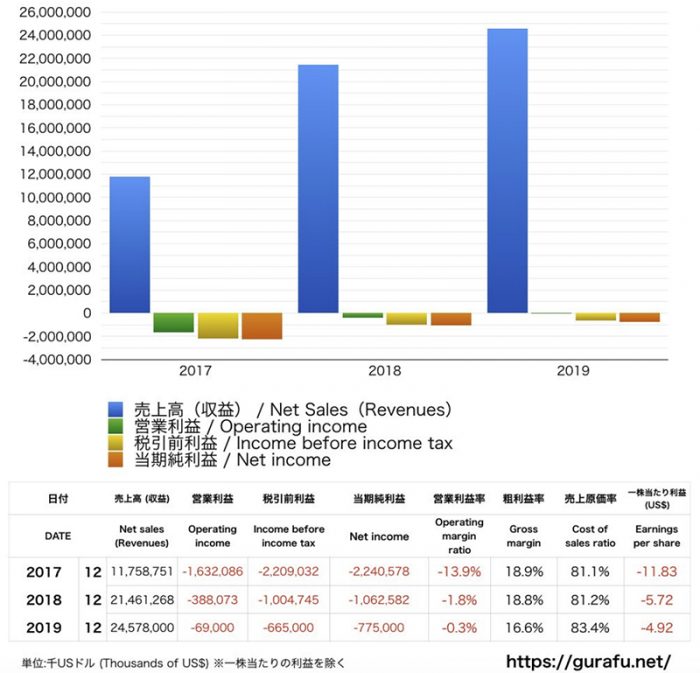 ではテスラの収益性はどうなのだろう?以下のグラフを見てもらいたい。そう。売り上げは伸びているが、利益はほとんど出ていないのだ。何故か?答えは簡単。巨額の先行投資をしているからだ。そしてその成長性を市場はトヨタや他の自動車会社より高く評価している。だから時価総額でトヨタ超えが起きる。売上高29兆9299億円、営業利益2兆4428億円のトヨタ、をだ。(2020年3月期決算)