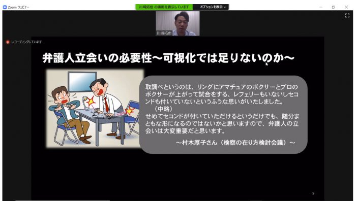 川崎氏は取調べを行う警察や検察が議論を避けたいと考えるのは当然だとして、実現のためには弁護人立ち会いを国民的議論に繋げ、国内の機運を高めることが不可欠だと述べた。