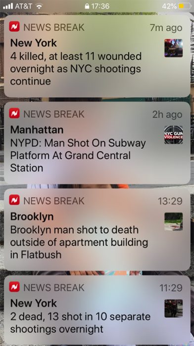▲写真 筆者の携帯に次々と入ってくる銃撃事件の速報。この日は昼前〜夕方5時までの間に市内で重大銃撃事件のニュース4件。7月以降、毎日この状態 出典:筆者提供