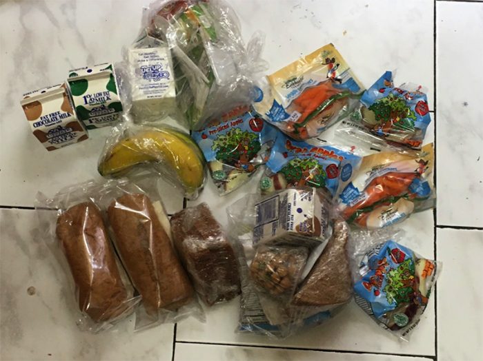 ▲写真 ニューヨーク市が配っている無料の朝昼食2人分。ターキーハム・チーズサンド、ハムサンド、ジャムサンド、コーンフレーク、ひよこ豆の煮物、りんごスライス、生にんじんスナック、バナナ、コーヒー牛乳、低脂肪乳 出典:筆者提供