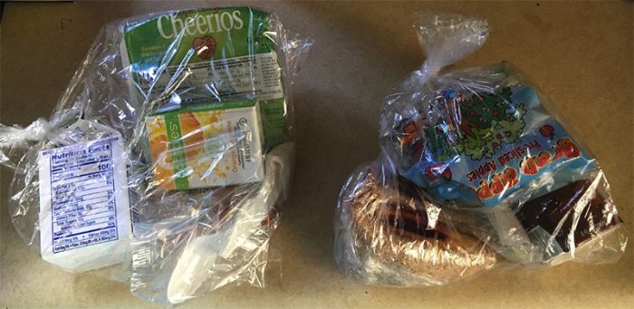 ▲写真 ニューヨーク市が配っている無料食料。左が朝食(コーンフレーク、牛乳、ジュース)右が昼食(りんごスライス、ジャムパン、付け合せ野菜)。内容は毎日変わるが3種類くらいの繰り返し 出典:筆者提供