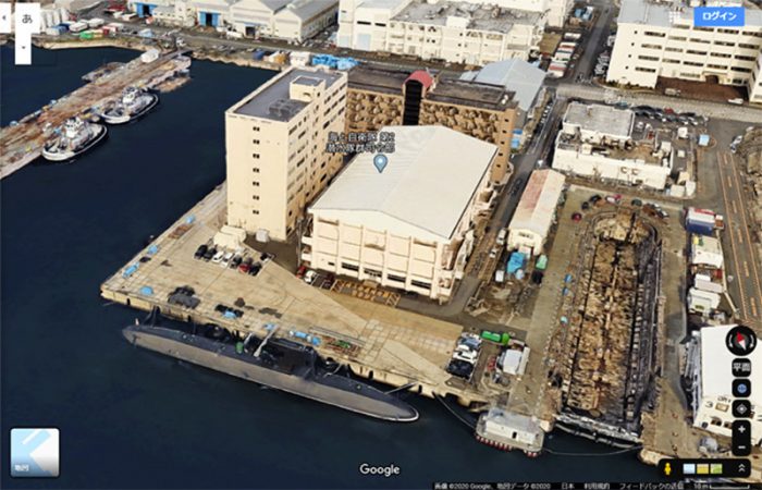 ▲写真 横須賀潜水艦基地隊。米海軍基地内に建っている。後ろにある赤い丸屋根の建物が乗員待機所である。潜水艦は狭く停泊中にも艦内で寝起きするのは厳しいため(使用が)認められている。 出典:Google Earth