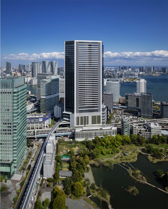 ▲写真 東京ポートシティ竹芝オフィスタワー 手前右下が旧芝離宮恩賜庭園 提供:東急不動産