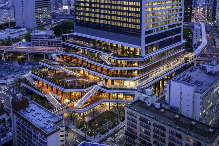 又こうしたテクノロジー面だけではなく、ビル自体、利用者の快適性を向上させる構造になっている。「スキップテラス」と名付けられた低層階(2~6階部分)の緑豊かなオープンエアー空間は実に6800㎡。こうした複合ビルでは異例の広さだ。東京湾も一望でき、海風を感じながら陽に当たっていると実に気持ちいい。夜の眺めも格別だろう。オフィスワーカーの心身の健康増進と生産性向上に貢献しそうだ。