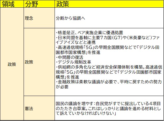 新型コロナウイルスで落ち込んだ経済を立て直すことを中心に、基本は安倍政権の政策運営の「修正」となっている。中でも核となるのは格差是正である。最低賃金の引き上げについてもだが、株の売買や配当などによる収益=キャピタルゲインにかかる税率を引き上げ、それを中間層の負担減に充てることを検討に値すると著書で述べるなどベースになるのは「格差」という名の「分断」の解消である。