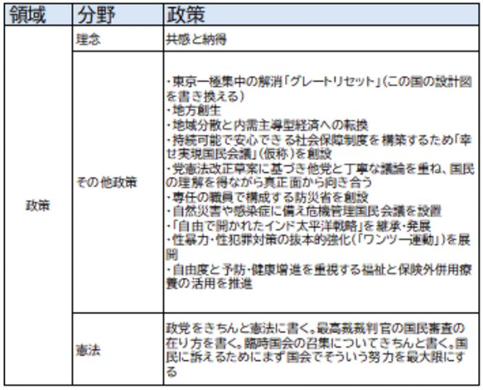 これまでもいってきた東京一極集中の解消や地方創生が大きな柱である。「石破ビジョン」では、「自由と寛容さを高めて女性、若者、高齢者にフェアな社会を実現します」とも掲げ、特に性暴力・性犯罪対策の抜本的強化を主張するなどリベラルな政策も内包する。