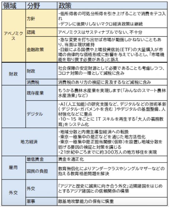 アベノミクスは「サスティナブルでない、不十分」という認識のもと、低所得者の可処分所得を引き上げることで消費のテコ入れを主張。日銀による国債や上場投資信託(ETF)の大量購入が市場の自律的な価格形成に影響を与えると指摘し、「市場機能を取り戻す必要がある」と訴えたほど。まさに路線を変えるということだ。アベノミクスの軟着陸を視野に入れている。