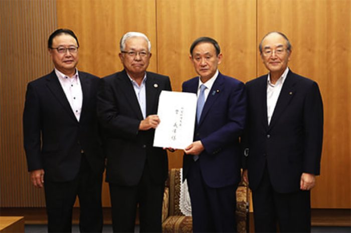 ▲写真 経団連、日商、経済同友会からの申し入れを受ける菅首相(2020年9月29日 首相官邸) 出典:経団連 facebook