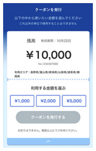 ①画面で電子クーポンを呼び出し、1000円、2000円、5000円の中から使いたい金額を選ぶ。