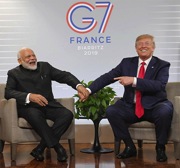 ▲写真 モディ印首相(左)とトランプ米大統領(右)(2019年8月28日 G7ビアリッツ・サミットにて)。米印の軍事協力は進む。 出典:Narendra Modi facebook