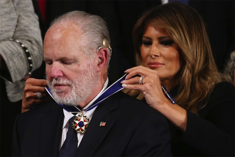 ▲写真 大統領自由勲章を与えられ、メラニア・トランプ氏にメダルを授けられるリムボウ氏 出典:Mario Tama/Getty Images