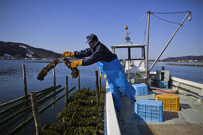 ▲写真 震災1年後、牡蠣の養殖業者(2012年3月12日) 出典:Daniel Berehulak /Getty Images