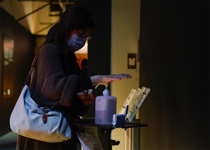 ▲写真 手指消毒用のアルコールを手に吹きかける人 出典:Christopher Jue/Getty Images