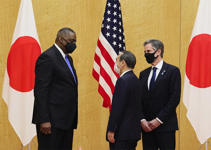 ▲写真 アントニー・ブリンケン米国務長官(右)とロイド・オースティン(左)米国防長官による表敬を受ける菅首相 出典:首相官邸