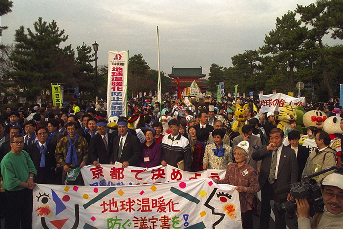 写真:第3回気候変動枠組条約締約国会議(地球温暖化防止京都会議、COP3)でより厳しい削減目標を求める人々によるデモンストレーション(1997年12月7日 京都市) 出典:THIERRY ORBAN/Sygma via Getty Images