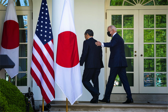 写真:菅首相とバイデン大統領(2021年4月16日 ホワイトハウス) 出典:Doug Mills-Pool/Getty Images
