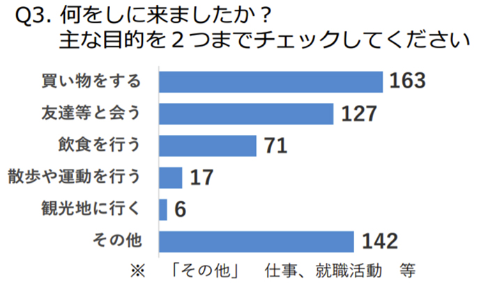 何をしにきたか、その理由を探るもの、買い物をする、友達等と会うというのが多かったようだ。これはまだ適切な設問である。