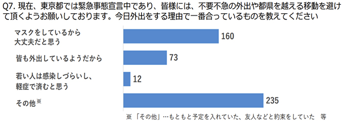 だから何?と突っ込みたくなるほど当たり前の結果である。アンケートの目的は、緊急事態宣言下においても外出が減らない要因を分析すること。それには適合していない。設問はまだいいが、選択肢が間違っている。緊急事態宣言下にも関わらず、なぜ外出したのか、という本質的な心理や意見を探るものになっていない。マスクで安全?周りも外出している?若いから大丈夫?という設問で十分ではないことは、「その他」の選択肢が最も多いことが結果を示している。