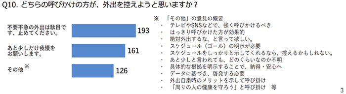 外出を控えない人に聞いたところはなかなか良い。しかし、本当にこうした呼びかけをした場合、認知して行動変容するのだろうか。