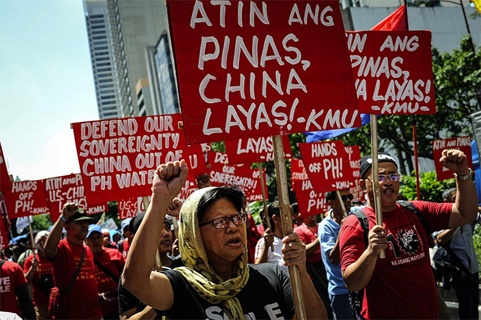 ▲写真 南沙諸島の島々における中国の領土主張に対する抗議集会 2016年7月12日にフィリピンのマカティの中国領事館前にて 出典:Dondi Tawatao/Getty Images